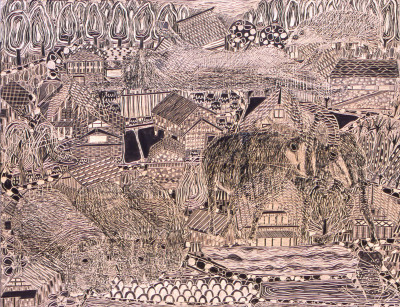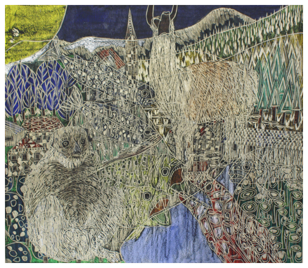 板という木目の優しいぬくもりのある支持体に、彫刻刀での「彫る」という−(マイナス)と、クレヨン・マーカー等での「描く」という+(プラス)の2つの方法で画面を構築しています。