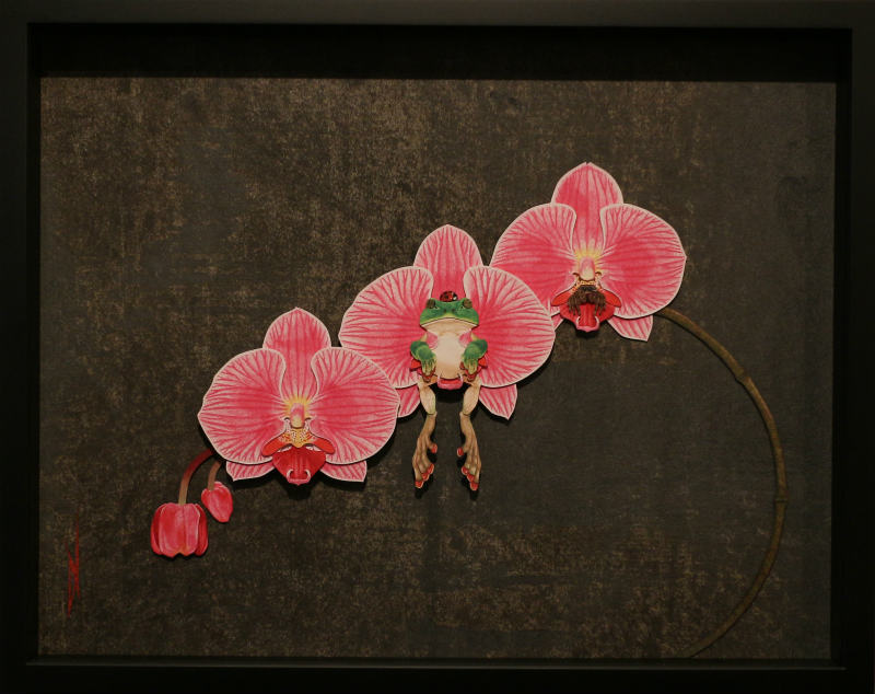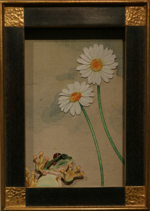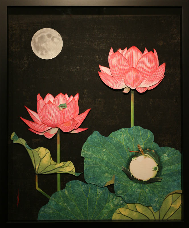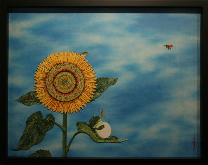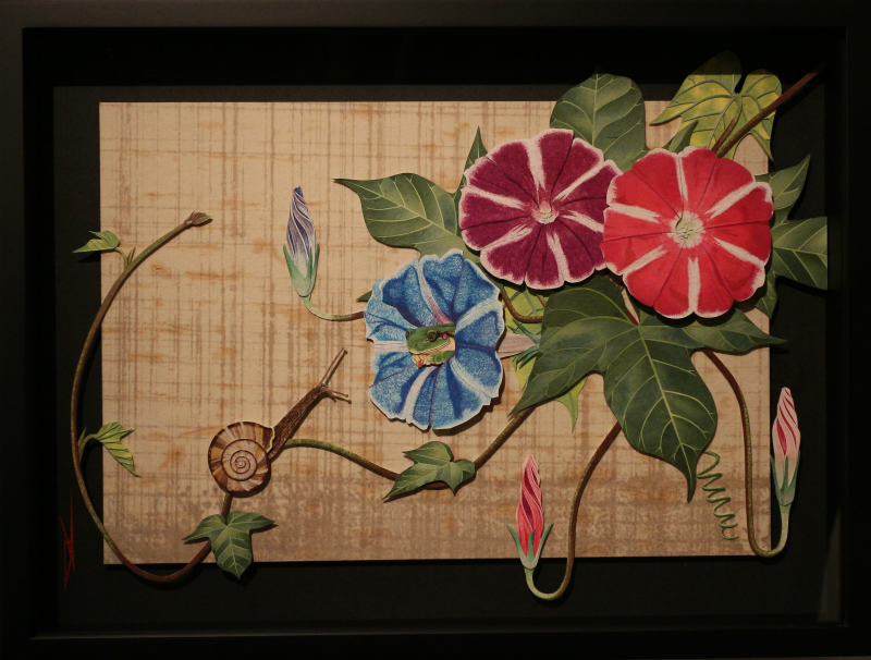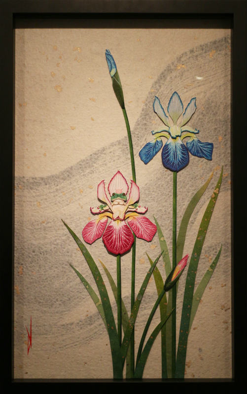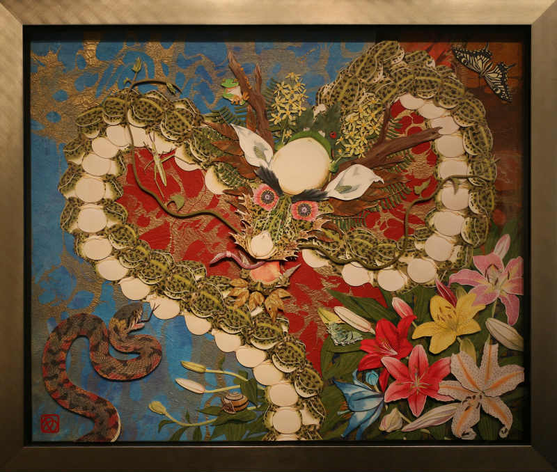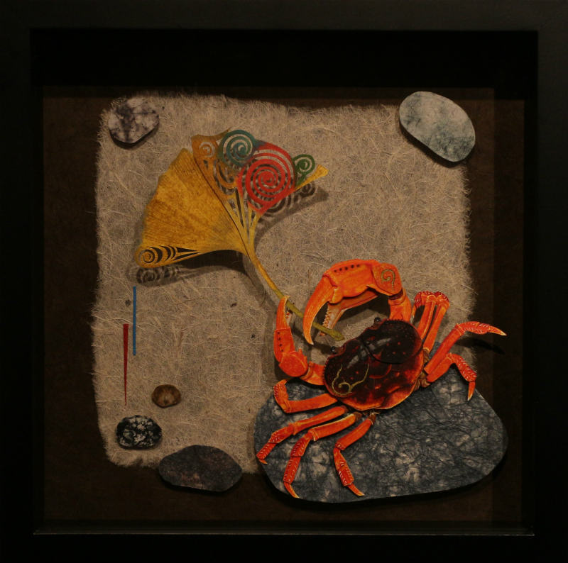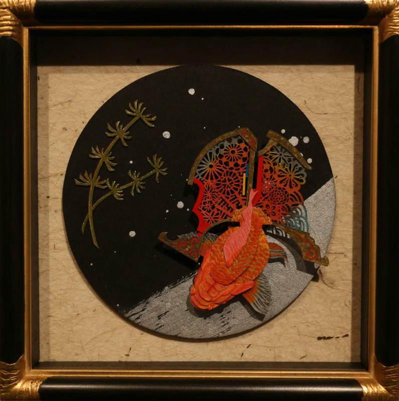 作品名 「夏の憧憬」 w581×h451×d10mm -紙戯び- 筆や絵具は使わず、切り絵やちぎり絵 はり絵などの技法を応用し紙のみで絵を描いています。 彩色には主にさまざまな和紙を多用します。既存の和紙の色味や質感をそのまま活かした表現や薄い和紙を貼り重ね色の混ぜ合わせを施し絵具のようなグラデーションを独自の技法で表現しています。またパーツごとに貼り重ねることにより立体感があるのも自身の作品の特徴です。 今回の展示では、季節(夏)にちなんだ動植物など自然の情景を憧憬と幻想の視点で描いた作品を中心に発表いたします。ユネスコ無形文化遺産に登録された和紙は、伝統的製法で製造された世界に誇る日本固有の芸術品。 風土に根付いたその息吹を敬い絵に作品に落とし込む作業は、紙と自身との対話であり楽しさと困難と可能性を秘めた云わば至上の戯び(あそび)でございます。