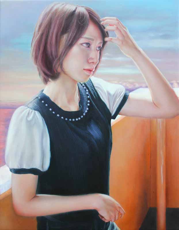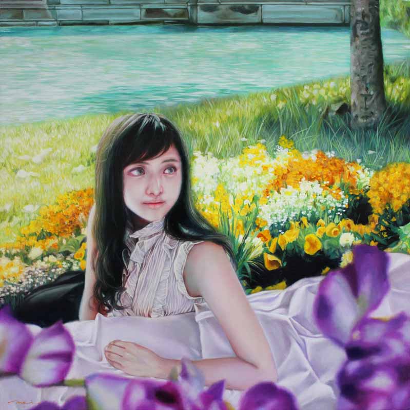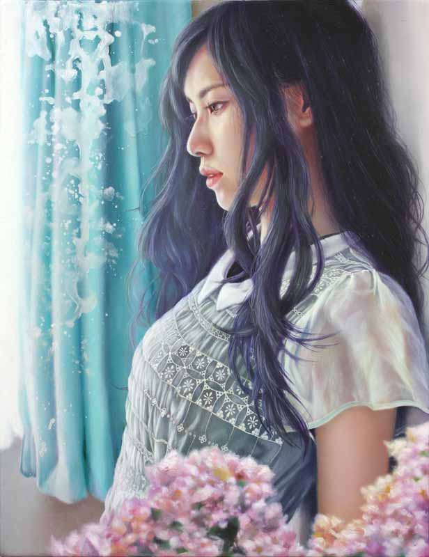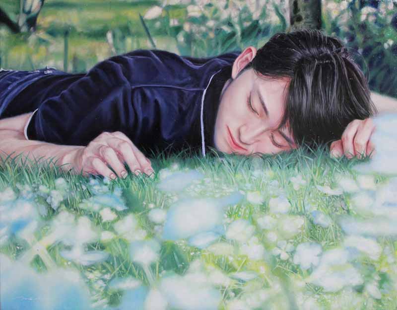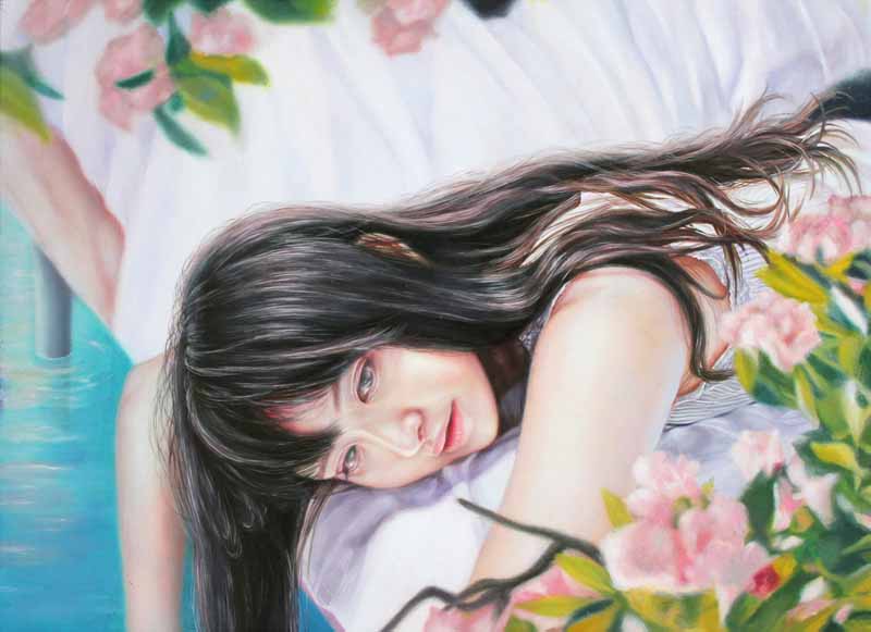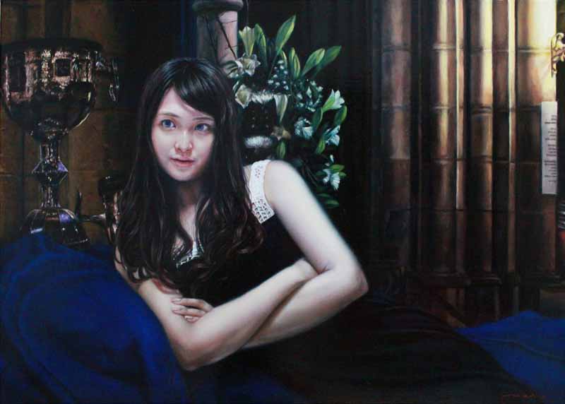 花が咲きみだれた森の中でソファーに横たわる女性を描いた「冴返る」(30号)を新生絵画賞展にて出展し、その不思議な世界感に審査員の目をひきました。透きとおる肌、考え事をしている視線、現実ではありえない空間の中横たわる女性像が印象的でした。