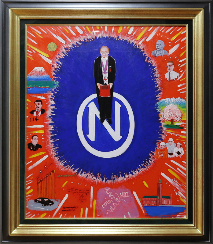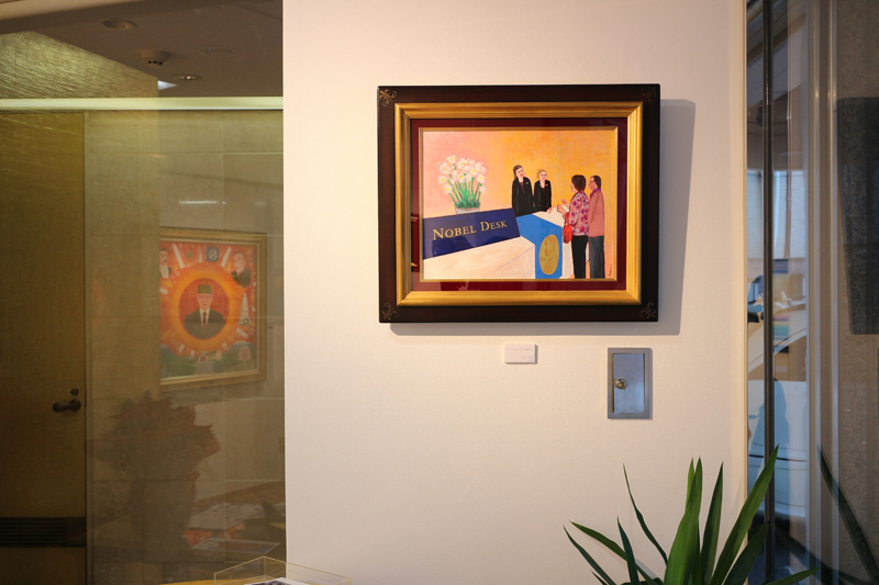 幸運にもノーベルミュージアムの前で博士にお会いすることができました。博士は笑顔で手を差し延べながら「よく来たねえ」と握手して下さいました。とても幸せな感動を覚えました。このような多くの思いを胸に作品を描きました。