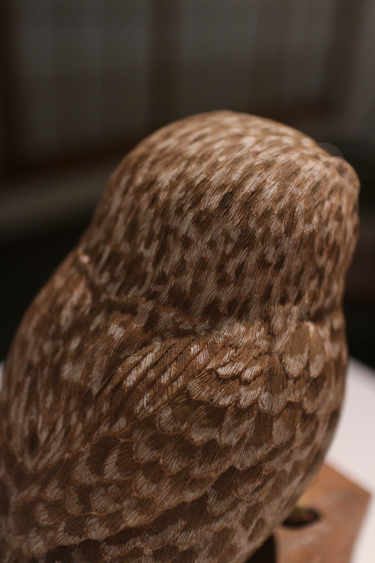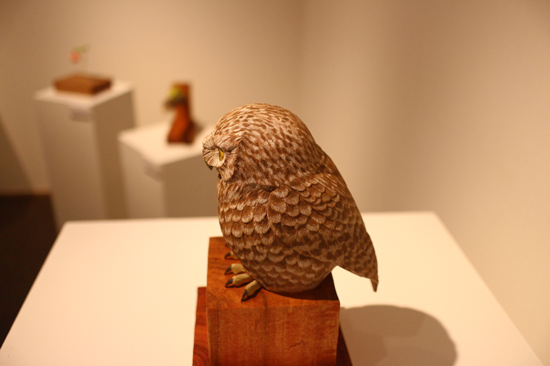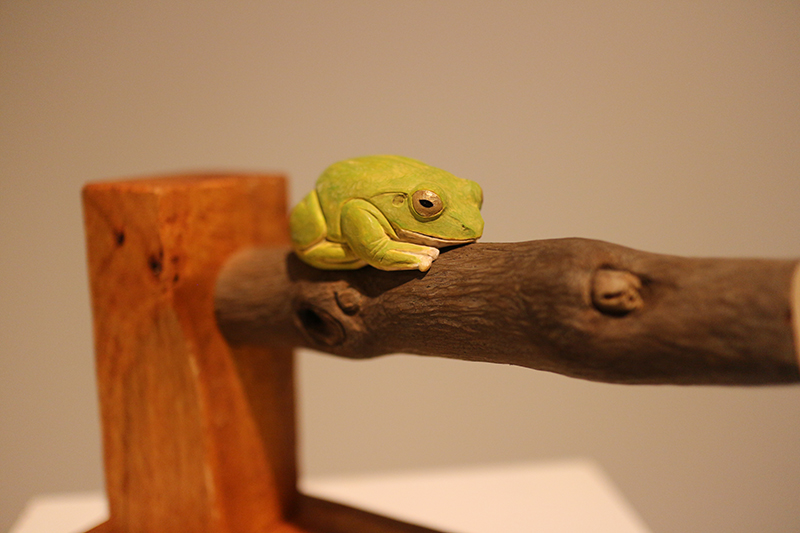 木彫で身近な動植物をほぼ実寸で制作。クローバーの葉っぱにとまる天道虫や、葉の上で休む雨蛙など、小さな命の