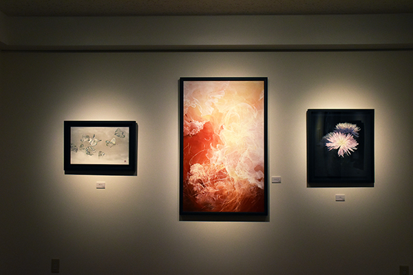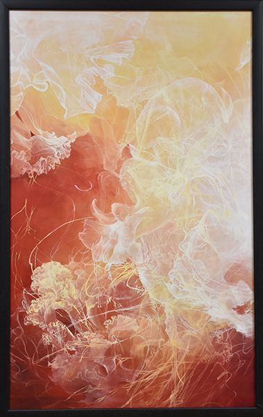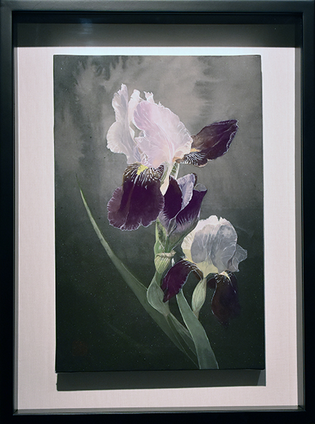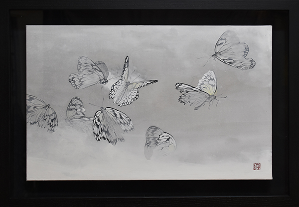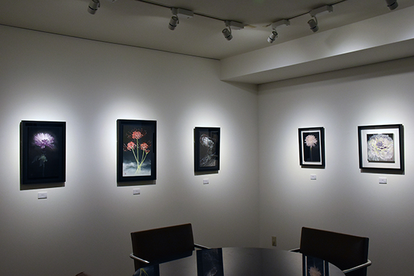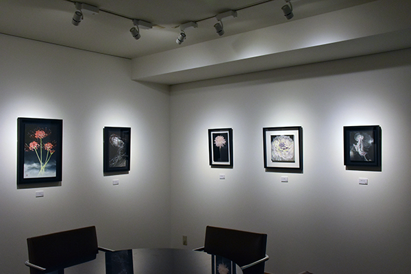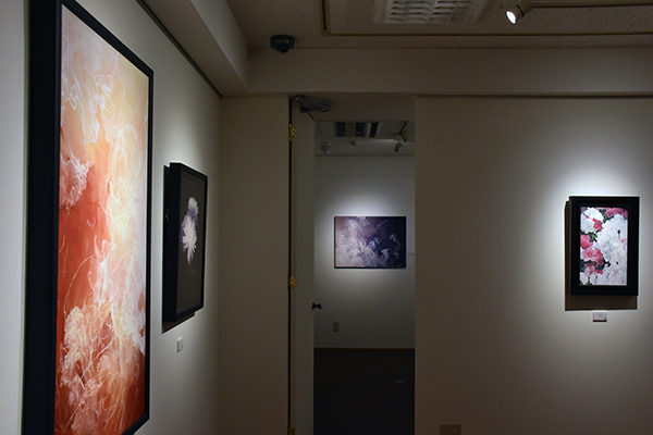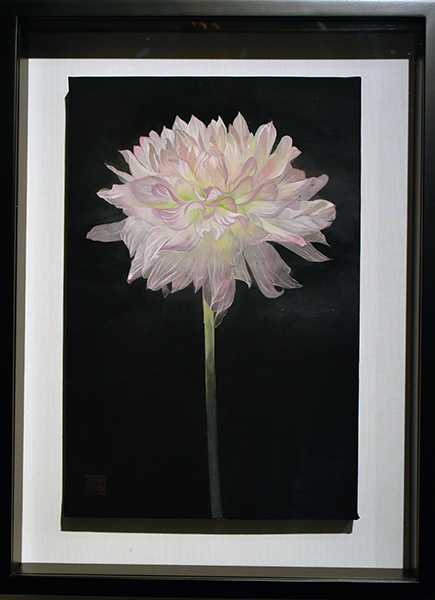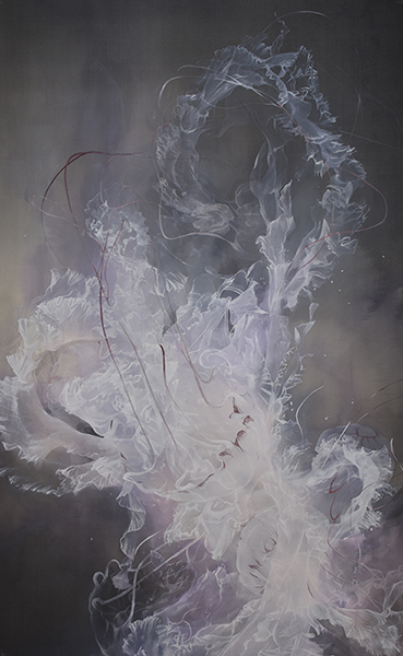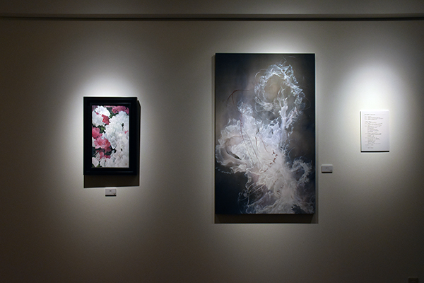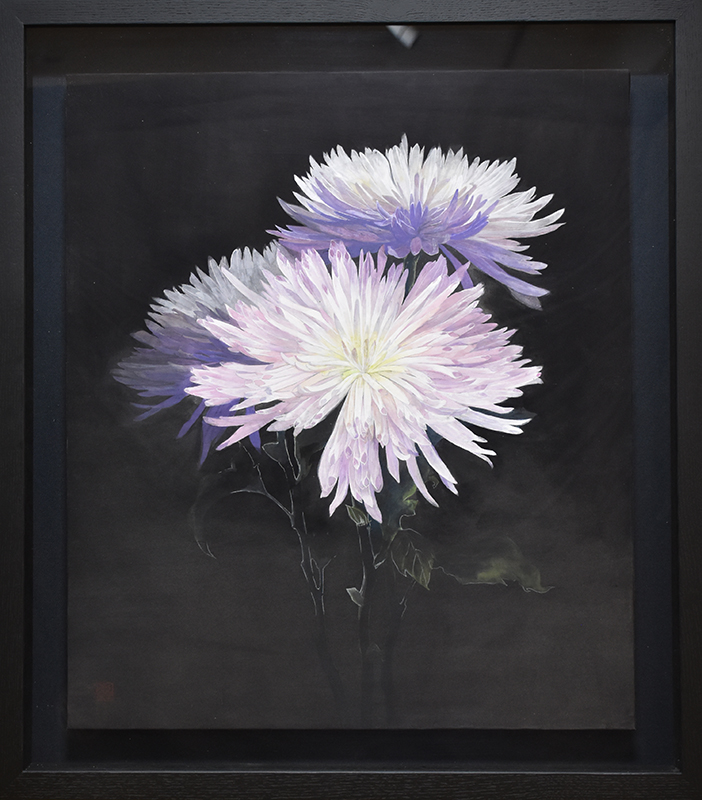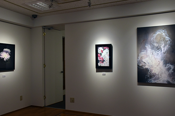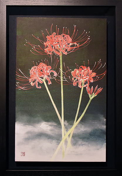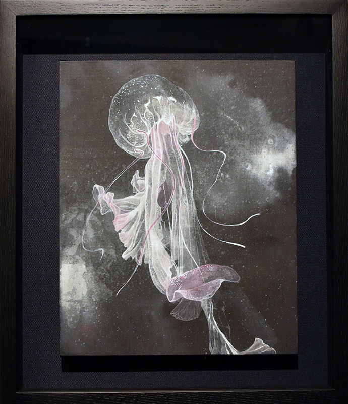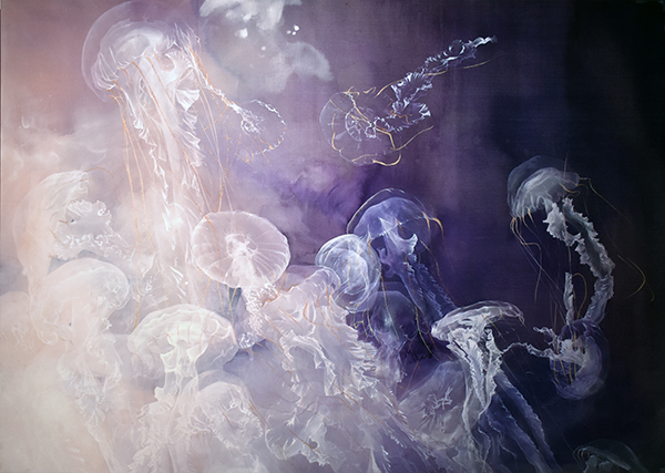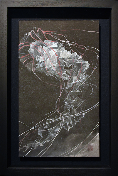 青木香保里は絹本を支持体として、華やかなクラゲや花の絵を描いています。