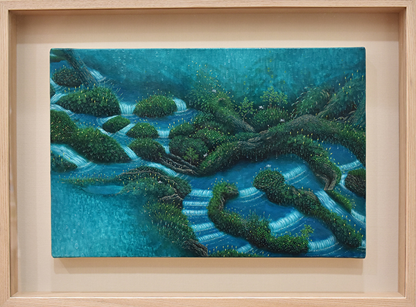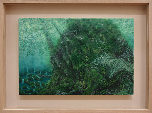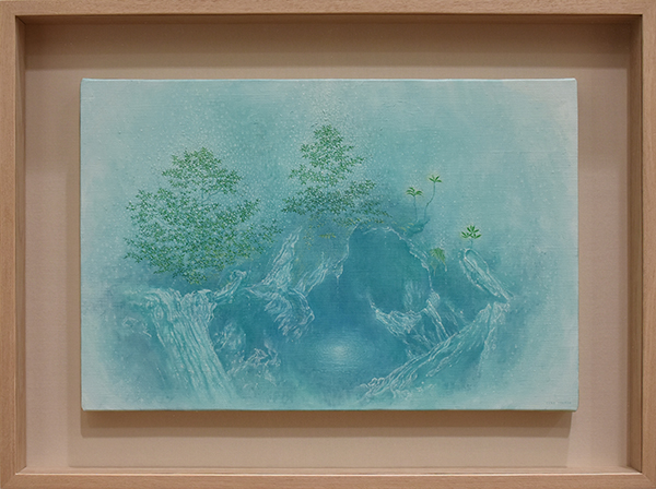 エレベーターを降りると、原生林に迷い込んだかのようで、鳥の声や海のさざ波の音、匂いや風をも想像させ、観る人の心にすっと寄り添ってくる作品たちでした。新生展の時は、公募という事もあり2点のみ現物審査なため、本当の作家の力量というのは個展でみえてくると感じています。高田さんは良い意味で期待をはるかに裏切り、屋久島の中でインスピレーションを受け、実際に日々の生活から吸収しているその感性を存分に東京の青山に運んでくれたような、そんな展覧会でした。