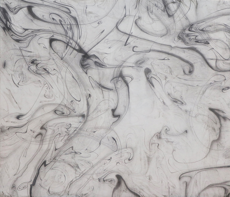 今回の制作では「墨流し」というまさに現象をそのまま定着させる技法を使用しています。偶然出来たそのままの形です。この「墨流し」を何層か重ねたり、またイメージを重ねたレイヤー構造で絵画空間の奥行きを出せないだろうか?と思い実験し、ここ数年何点かの作品を作ってきました。