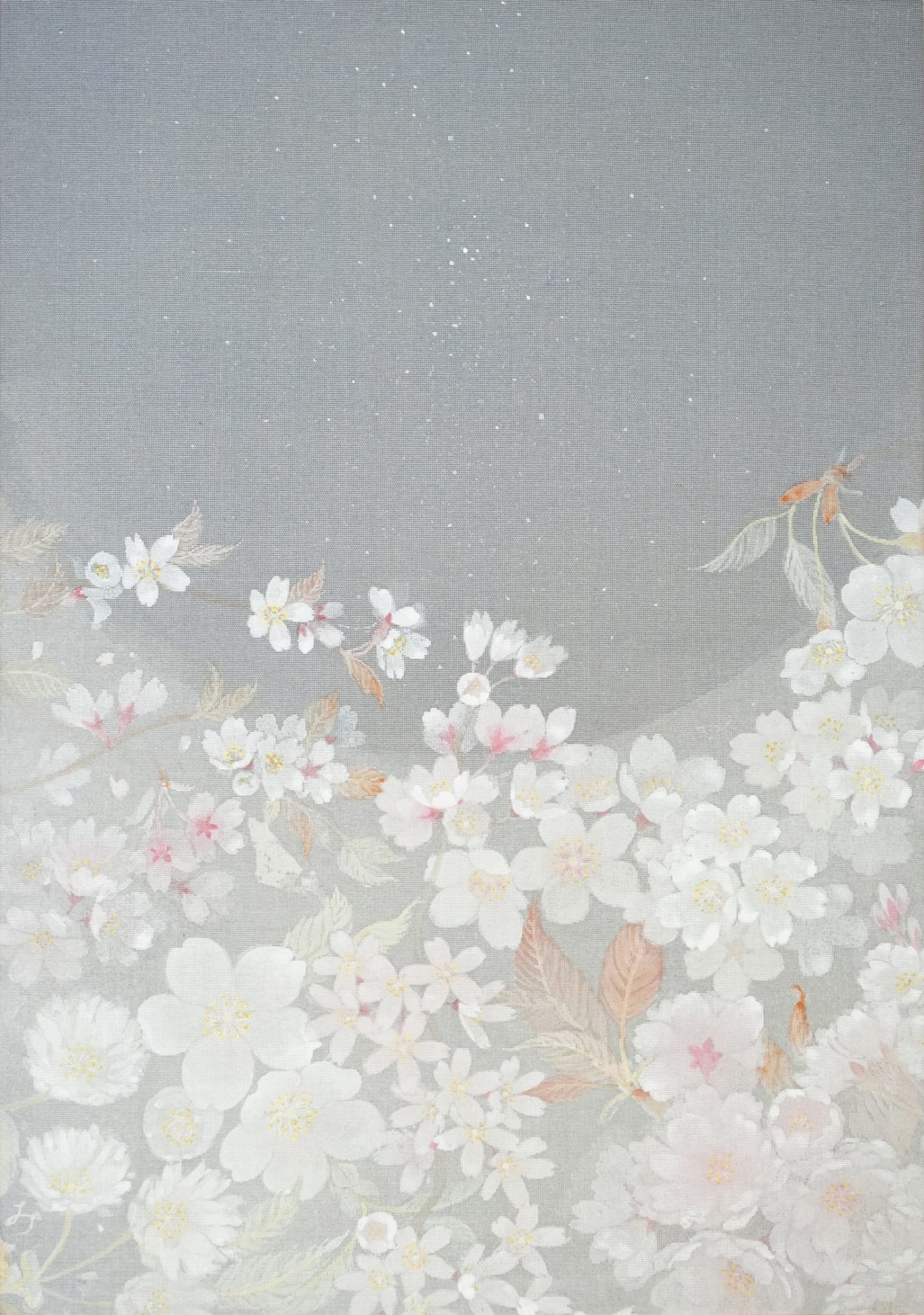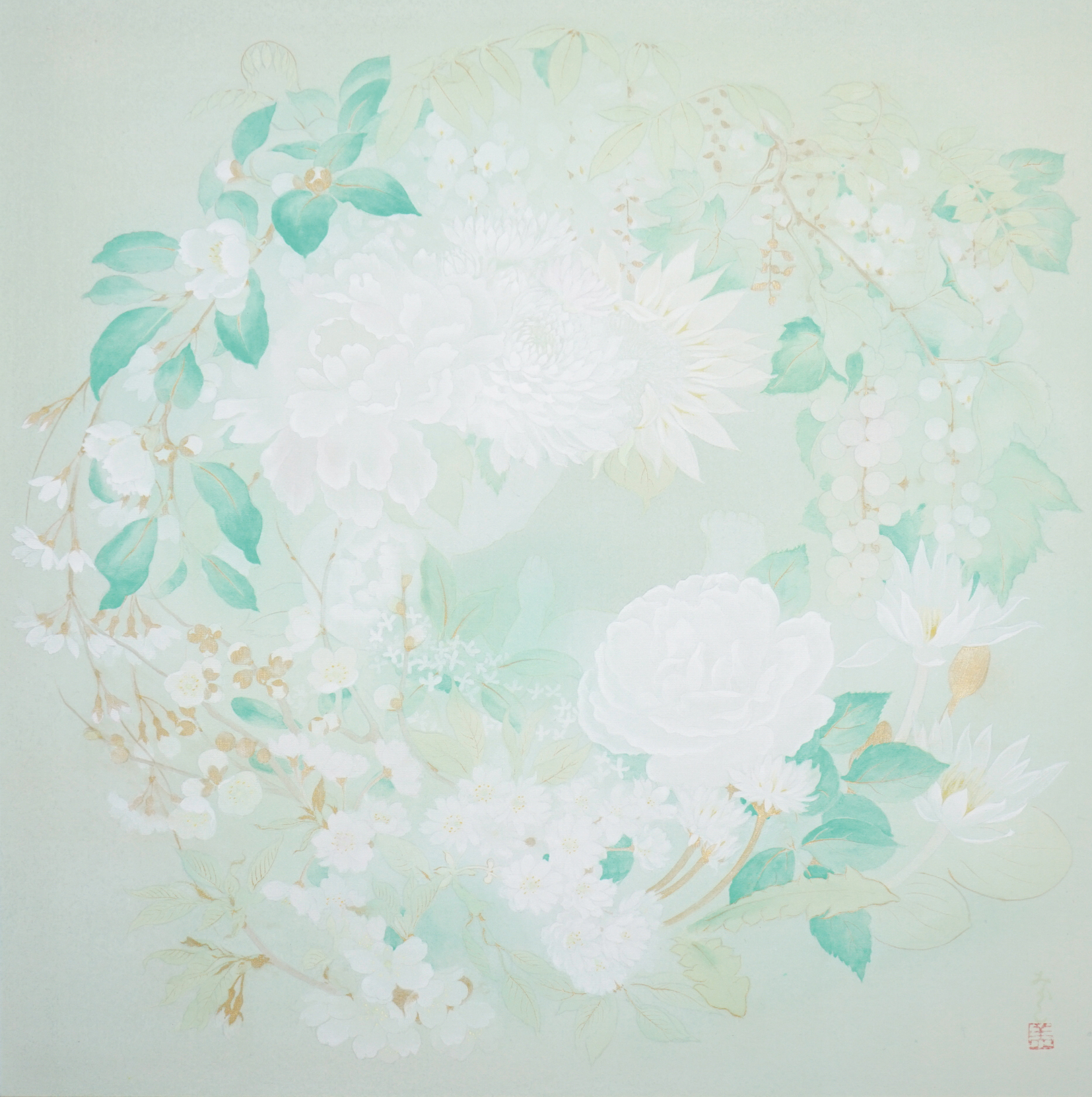 蕾から咲散るまでの花の生命力を、絵に静かに閉じ込めるように、絵具を一筆一筆おいていく様が作品からもみてとれます。