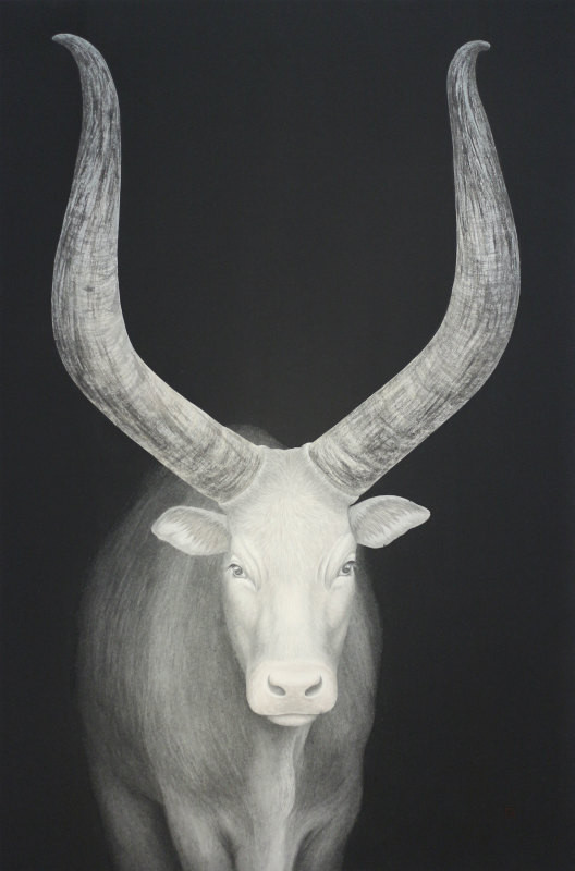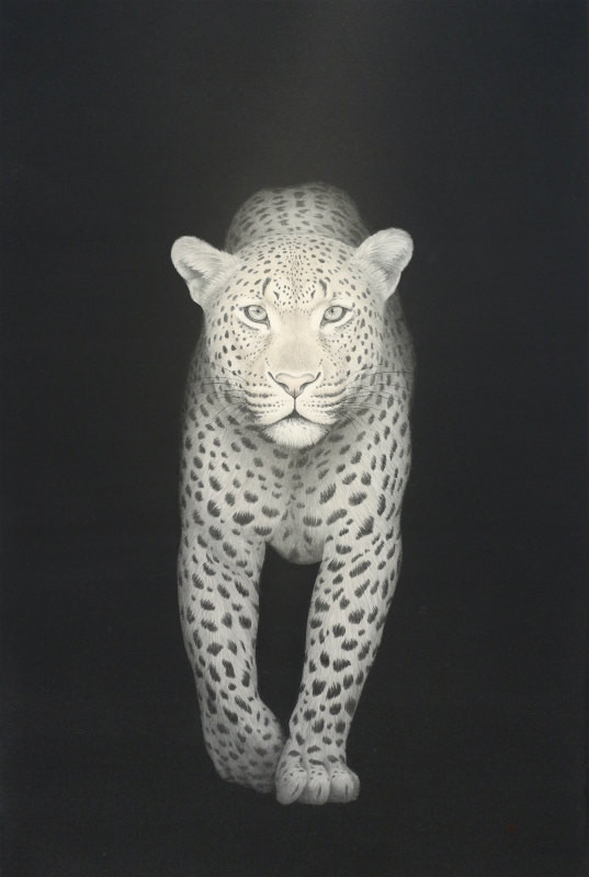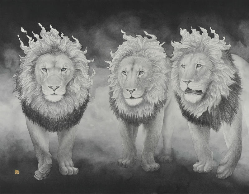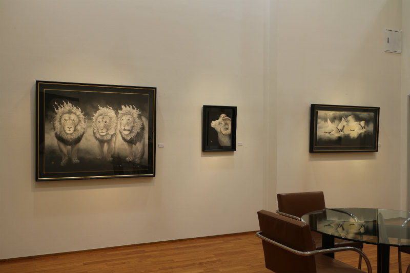 今展では、たてがみを奮い立たせ逞しく生き抜いて行こうとする雄ライオンや、越冬する雌雄の鶴など、強い意志を宿した動物たちの眼差しを追い、'旅立ち'をテーマに自然に立ち向かって行く生き物たちの姿を捉えた墨、岩絵の具、金泥による新作展を開催いたします。