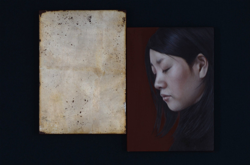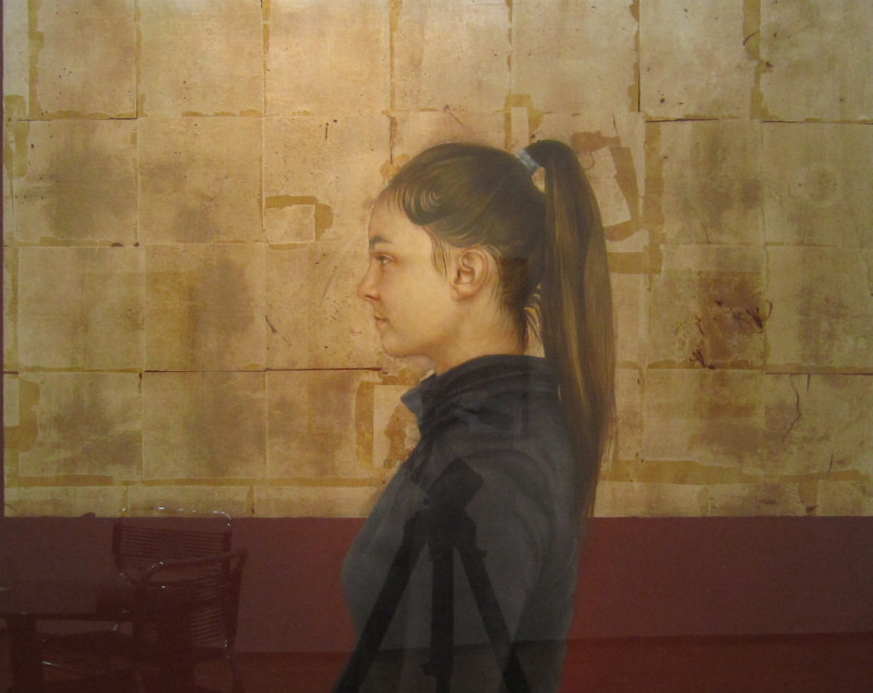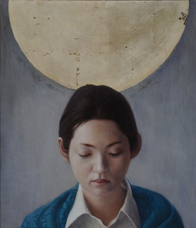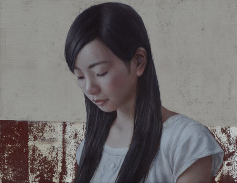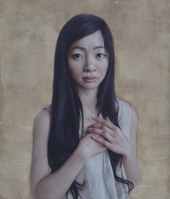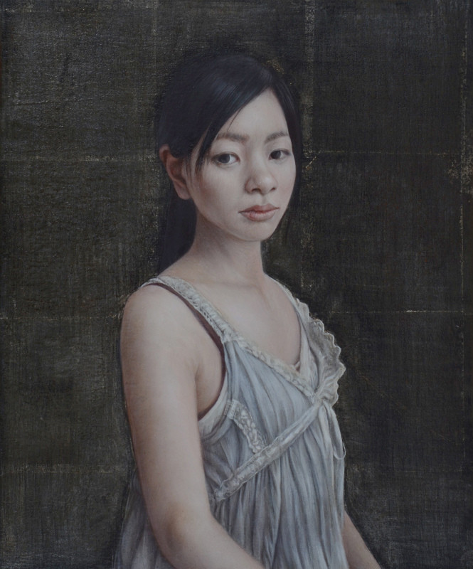 中世の古典技法であるテンペラと、油彩画を混合させ、背景は箔だけの場合が多く、人物がよりひきたって見えてくる分、その人の表情からみえる感情がより強く見えてくるように感じられます。ひと筆ひと筆、絵を通して対話し心の奥の気持ちや、その人の生きてきた時間など、絵には見えない内面部分も丁寧に導きだすように描いています。