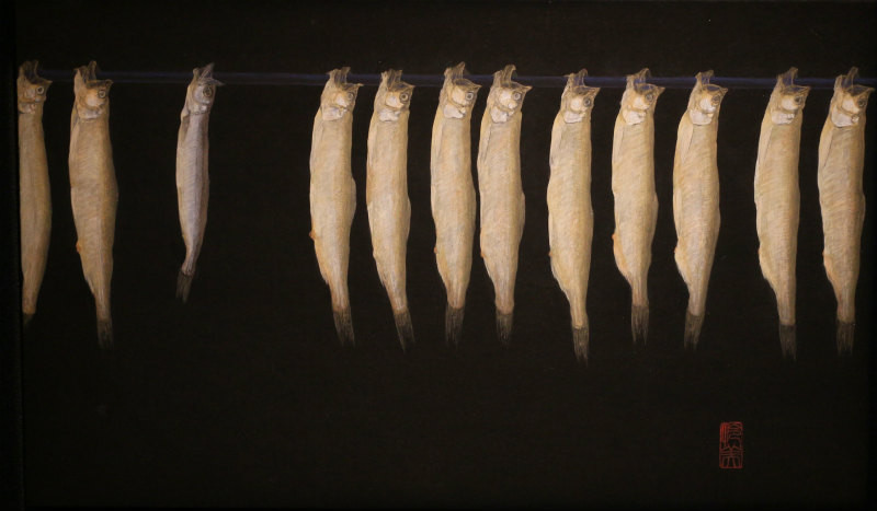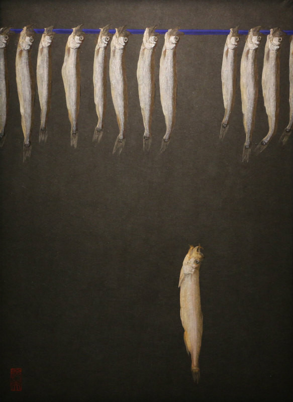 売られた状態の魚や、干物になった魚などが描かれ、作品につけられたタイトルによってユーモラス